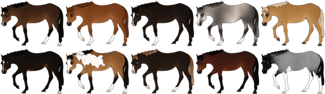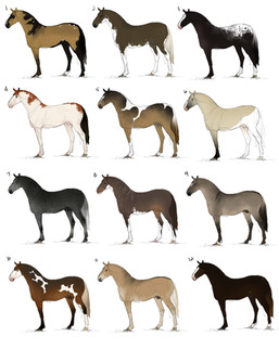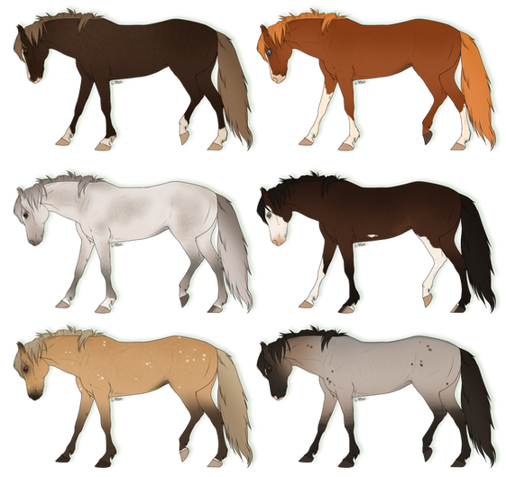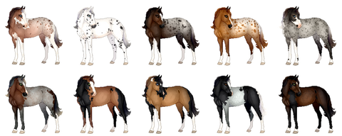 Heterozygous varnish roan, homozygous varnish roan, leopard, fewspot, blanket, and snowcap appaloosa.