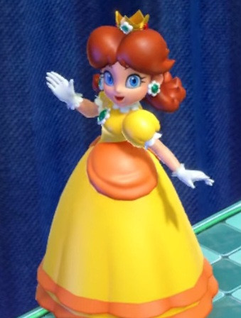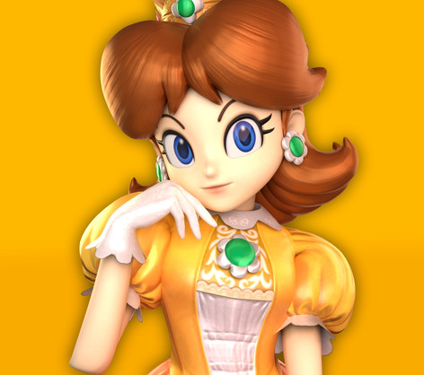 Screenshot from Super Smash Bros. Ultimate.Daisy crouching and smiling.