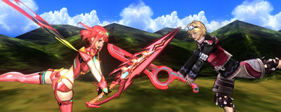 Screenshot from Super Smash Bros. Ultimate.Pyra together with Shulk.