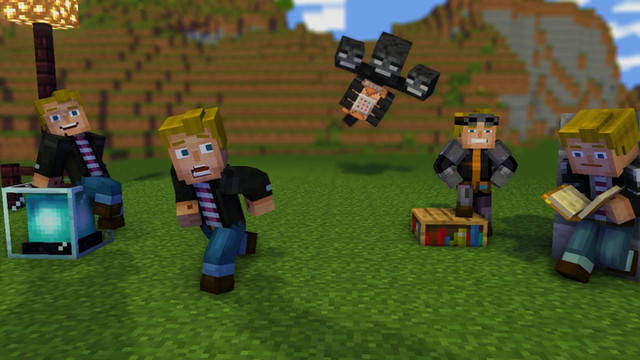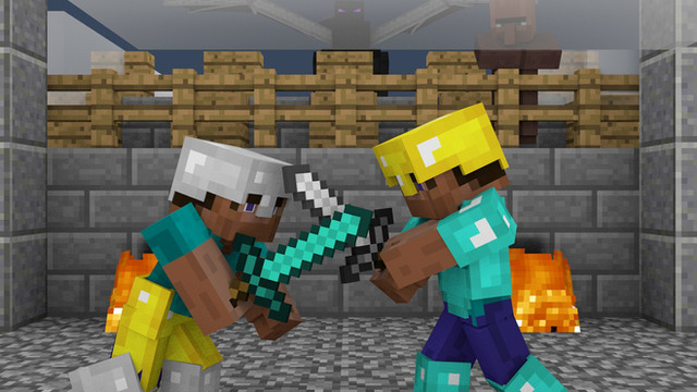 Screenshot from Super Smash Bros. Ultimate.Steve in the tower with two players chases him for destroy.