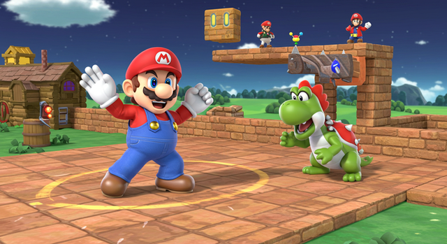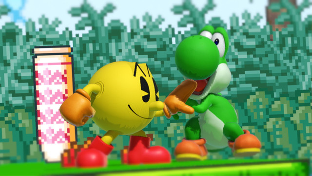 Screenshot from Super Smash Bros. Ultimate.Yoshi sticks his tongue out on red Yoshi.