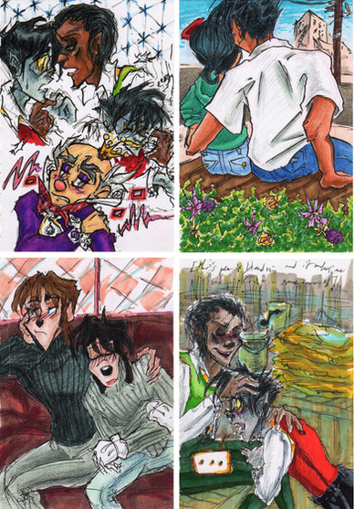 I used cheaper Bic Mark-Its on rag marker paper; their skin colors and part of the background was filled in with Prismacolor skin tone markers. (For some reason the violet likes to get altered into a bluer shade when I scan it in *sighs* I wonder if it will do the same if I use thicker bristol board paper).