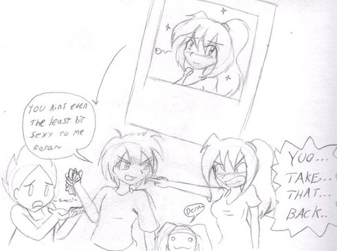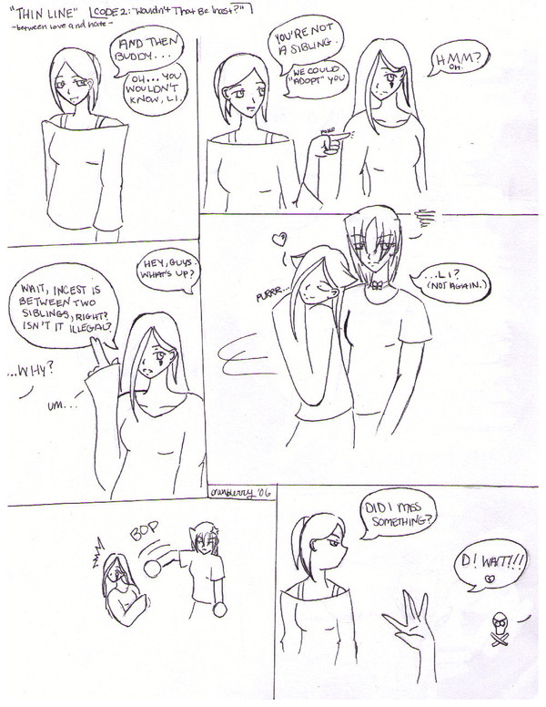 Somewhat of an inside joke, I guess, but not really. Whenever D and Kira ask me if I want to be "adopted," I laugh and ask, "Wouldn't that be incest?" When they give me looks, I cling to D. At that point, they give me even stranger looks.