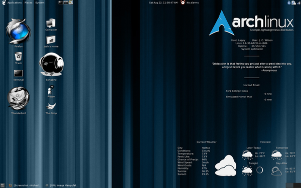A screenshot of my current desktop. I'm running Arch Linux with XFCE. In the terminal I've run screenfetch.It's a little more conservative than some of my other screenshots.
