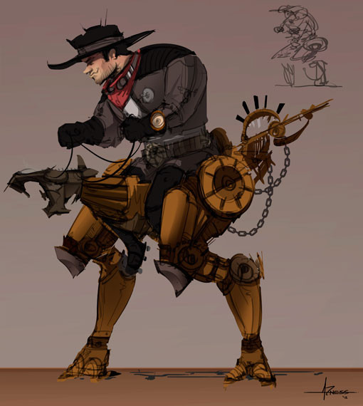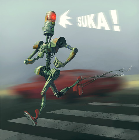 Wonderful work, and I loved the story you had to go with it! Like the perspective most of allβit's like the viewer is just walking along when suddenly there's a robot leaping over them.