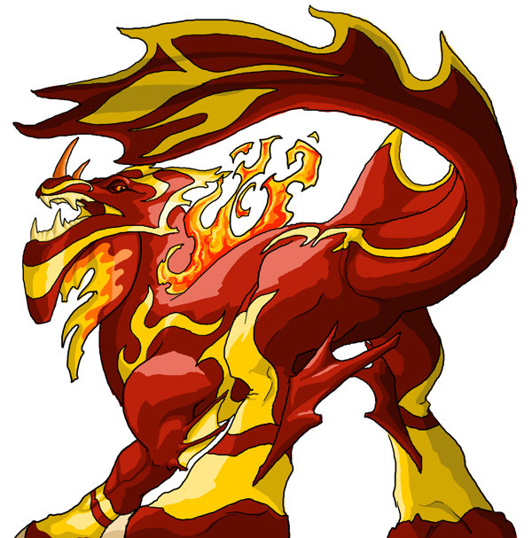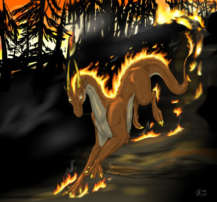 I really REALLY like the fire. The liquid squirting from some unknown glands is a really cool detail, and it shows that dragons don't have to be fantasy. The angle on this is pretty amazing too. I know I can't draw perspective like that.