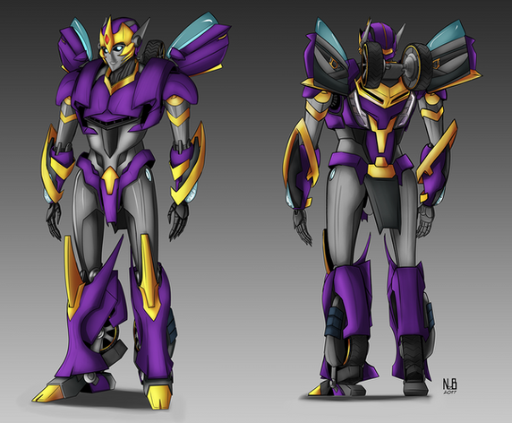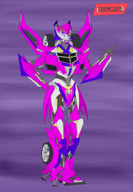 All in all the glow and color scheme does look pretty. But what does she transform into? The circle wheels gives an idea of futuristic vehicle, but with other arm being bigger than the other it kinda breaks the image of a sleek fast future car I get