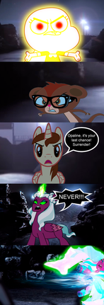 My team and I are ready for the final battle.By the way, if you have been wondering why Diane and Kim Possible are different because they will take the power of their flowers (Diane has the power of the Ice Flower and Kim Possible has the power of the Fire Flower) and Caleb is still up in the sky.