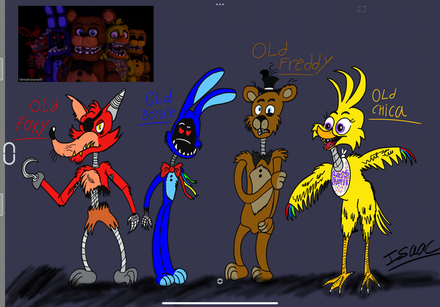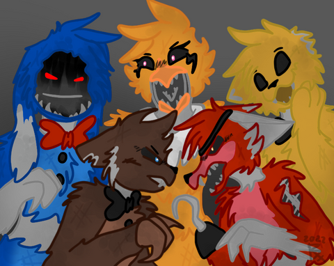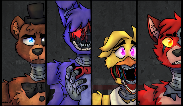 In my AU, they've been fixed but decided to keep most of the obvious damage.They're also the opposite gender of the fnaf 1 animatronics.