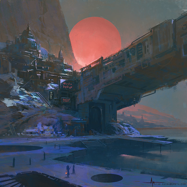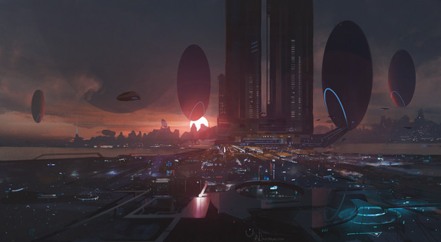 Holy, epically wondrous! This Majestic Sci-Fi Esque City is stunning and The Space Ships look incredible. The designs, reflection, machinery, technology, laser jets, flight, street, marketplace, mansion, stores, signs, buildings, oriental symbols, sky, moon, citizens, poses, expressions, interactions, clothing, sidewalks, decor, neon signs, roofs, windows, stop lights, pathway, terrain, mist, movement, effects, flow, perspective, realisticness, atmosphere, hues, textures, composition, concept, uniqueness, lighting, colors, style, and other details are also sensational. Amazingly Radical work!