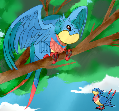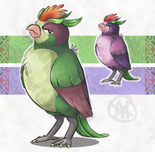 Design: bird with a puffy chest like a frigatebird, but is not a frigatebird. Is just bird. About the dex entry... so for the Aian region, I wanted the dex entries to sounds AI Generated, but without actually being AI generated as I need specific information in them. So instead, I corrupted it with Google Translate a few times before finding something I liked. I don't want to corrupt it too much as it still needs to make sense.