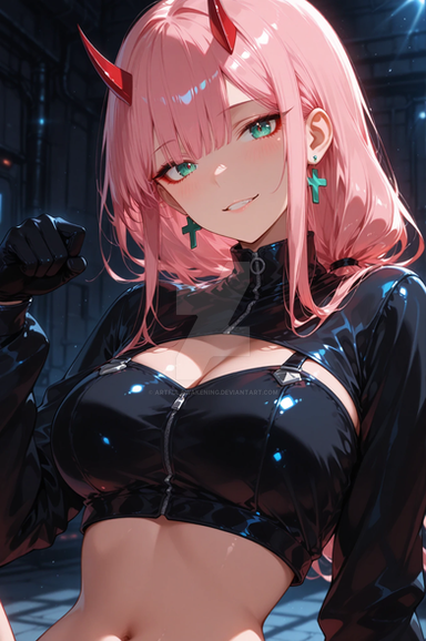 #fanart #digitalart #portrait #bangs #blush #bodysuit #breasts #cleavage #collarbone #horns #long_hair #makeup #saliva #shiny #sitting #smile #sweat #tongue #green_eyes #pink_hair #shiny_hair #looking_at_viewer #large_breasts #open_mouth #straight_hair #tongue_out #open_clothes #shiny_skin #zero_twodarlinginthefranxx #outstretched_arms