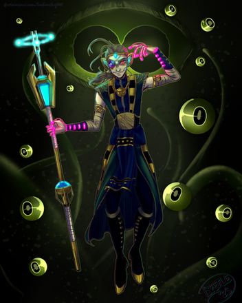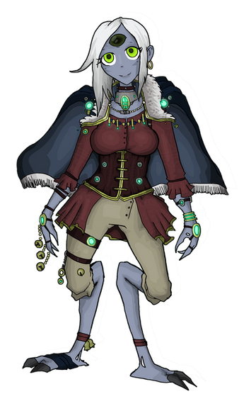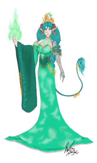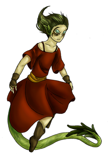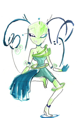 An amazing concept, a mechanical siren. Personality changes are something you wouldn't expect in a siren, but if I were to imagine her in a fan fiction, it would draw readers closer to her. The green of different shades is a complimenting touch, and the creative use of hair? Stunning. She would be quite an asset in any story.