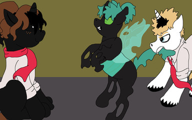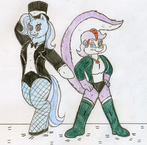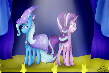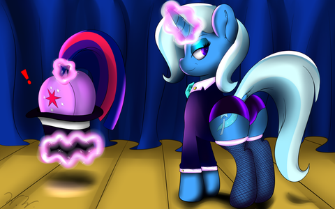Starlight and Trixie putting on a magic show, their latest trick? Turning a fellow pony into a bunnyI really love how Trix and Starlight came out, not too keen on the background though X3 Also Starlight's outfit is inspired by Zatanna's classic look :3 The hat John bunny is coming out of is meant to be Starlight's - Trixie thought hers was too important to do the trick with XD
