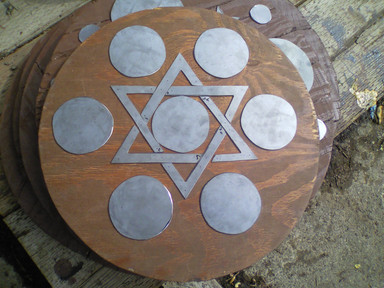 10 inch copper and aluminum wall hanging. The copper symbols are held by hand set solid copper rivets.Related content