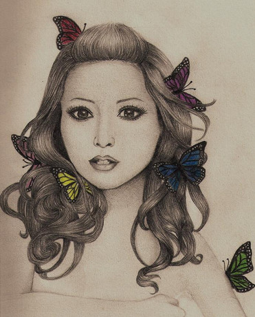 This i quite a creative piece. The hair on it is just great. And although it does look realistic, maybe adding more on features like the nose and inside the neck. Also, maybe more detail into the eyelashes, since it is hair. Also maybe some more detail on the eyes. But you did a great job at controlling the smudging, and the perspective is pretty much right on. I love the butterfly as well. So elegant and matches the piece quite well. And that nose shading is better then drawing the lines. Aside from that, This a great piece. Keep up the work!