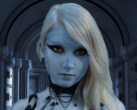 I love the series of images that these models are in and I had this concept ... it would have been easy to do a vampire theme, but I decided that I much prefer to test out a new concept or two ... The big experiment was making a more demonic looking character... I had an image in my mind for some time... so I got to work on the techniques to make it happen. I'm an expert on eyes they were easy ... the scales took some working with. The main problem was the scales on DA were all high resolution... until I hit my head on the wall realizing I could scale the image down to get scales the size I wanted them