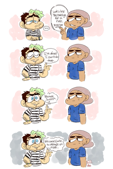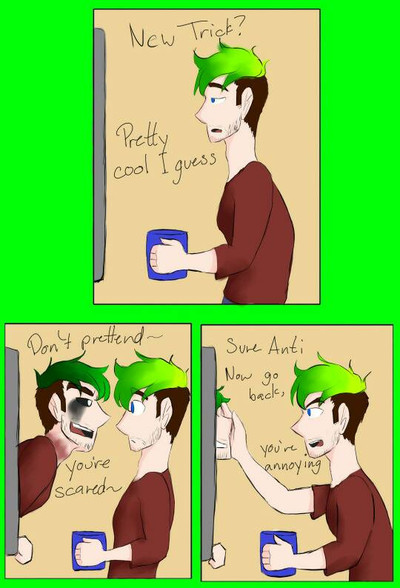 This was also inspired by this post bc ik Anti is suppose to look all Scary and Intimidating there, but his floofy hair bouncing around all over the place makes it hard for me to take him seriously and I always end up giggling whenever I look at it. I also imagined Robbie playing with Anti’s hair when I saw it, too, so that’s how this comic was born!