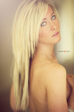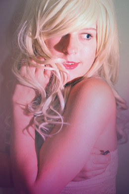 Wow, she looks exceptionally beautiful with her bright eyes gazing forth as her platinum blonde fringe sweeps around her, posed so sensually with her fingers tracing her neck, arm pressed into her breast as the other rests against her arm, the centre teased by the spiralling strands of hair cascading before it. The lighting is wonderful too with her right side brightly illuminated, providing a great contrast with her right and accentuating her forms.