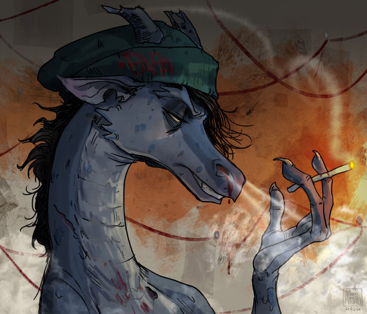 Also, I really did want to draw Snail, so I thought I'd draw him during a hard depressive episode, since he suffers from depression and during bad episodes, his personal hygiene goes to shit, so he's got his extra greasy hair, depression beard, and the most rumpled gross t-shirt ever.