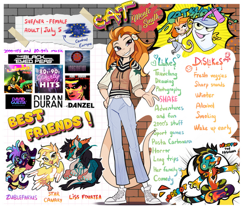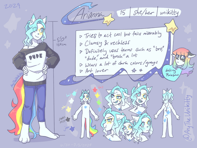 A bunny boy with blue hair. Yellow eyes and a punk shirt? He has a scar on his neck. A bandaid on his nose and I think that is it.