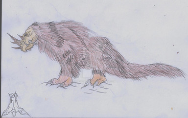 Then again, you got the shag part right, and the head is angled down like a megatherium.. this basically looks like a quadrupedal giant sloth, which is -awesomecool-. In fact, if I'm not mistaken.. megatheria had scales under their fur too..