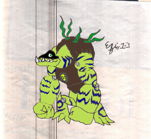 Appearance-wise, their stance would go from a bipedal form that's slightly hunched over to something more akin to a dinosaur. As such, their tails have dramatically lengthened and strengthened in order to balance themselves, as well as develop a set of large, oar-like scales to act as a tail fluke. Their knuckles would become larger as they would resort to using them like an extra pair of legs, which would allow for them to grow much, much bigger - with their devolved form being about ten feet tall, they would be able to grow to a length of forty feet, with their tail covering about 15 feet or so of that. Furthermore, they would develop a pair of large sails on their backs, a bulging throat pouch like a bullfrog, a series of armored plating on their backs, shoulders, and legs. Most notable however, their entire back would be covered in a small ecosystem, complete with small trees and lots of low-lying vegetation, all of which is a part of their biology; the Ultimatrix would be located on a collar around their neck.