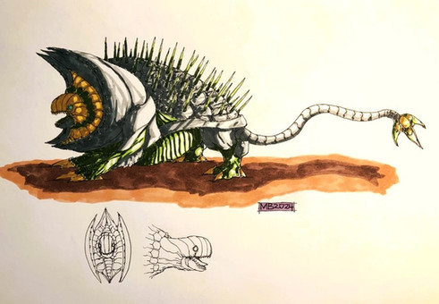 As easily distinguished by its heavily armored head, Osteophinatitans originated from fossil remains of Dunkleosteus found on Earth whose genes and DNA were manipulated to engineer a natural predator for the Selamusclin by their bitter enemies, Machecamarin. The objective was to essentially to either drive their arch nemesi into extinction or to distract them long enough for the Machecamarin to emerge victorious in their nearly one-thousand year long war. No word on whether such a victory has been achieved yet.