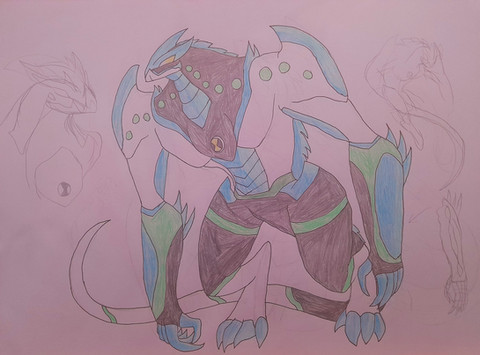Greetings citizens of the universe! I hope you all had a spectacular New Years and are hopefully sober enough to read this without passing out (I know your out there . . . somewhere . . .). That being said, I have decided to take a break from working on requests long enough to crank out a few personal projects of my own just to let you all know that I've still got it and don't need to take orders from anyone for every piece I make. So ring in the New Year, here's a new alien for you all!Believe it or not, this was actually a concept created by my younger cousin when I asked him if there was an OC alien of his that he wanted me to create - he's a fan of the Ben 10 series as well, largely thanks to me I suppose - and this is the resulting piece.