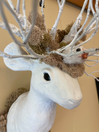 Made using driftwood, milkweed pod, unknown root bulb (head), pine cone scales, twigs. and shale pebble eyes. Perched on a driftwood branch and mounted on a black wood base. Total height is 10".Related content