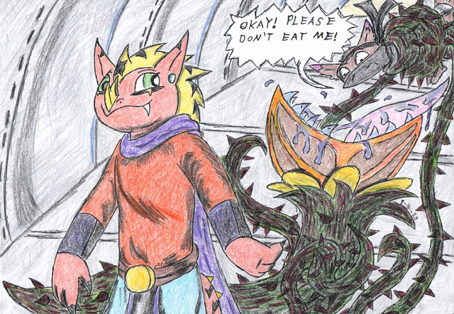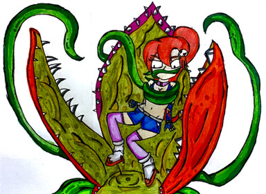 "Hey, these things better not eat us!" shouted the Elf as one of the roses got closer to her face. She reeled her head back in fear as the rose hissed. Erika turns around with a nervous smile.