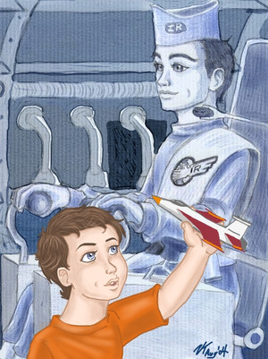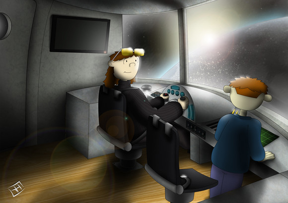 Regalo di compleanno - in ritardissimo, perdonami!! - per . Non ero riuscita a finirlo in tempo per l'anno scorso e volevo regalartelo quest'anno, solo che sono stata senza computer fino alla settimana scorsa... comunque anche se in ritardo, spero che ti piaccia lo stesso!Il Capitano McCrea da bambino, con Auto. Mi piace pensare che l'Autopilota fosse un po' una figura paterna per lui e che si fosse occupato del suo addestramento da comandante (McCrea sembra fare molto piΓΉ riferimento a lui che al suo predecessore O'Brien)