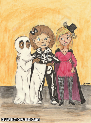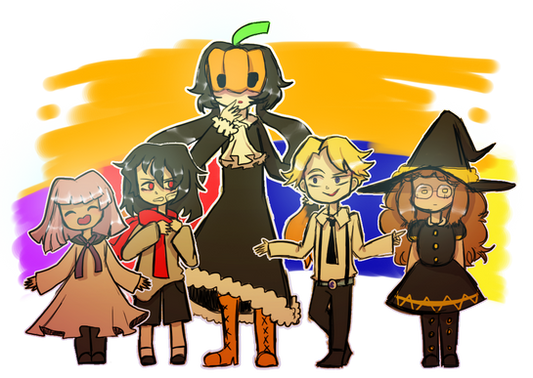 Happy Halloween! Here's some of my OCs in Halloween costumes!These characters don't live on earth, so I doubt they would celebrate Halloween, but Reeds (far right) as a sheet ghost is the greatest idea I have ever come up with.
