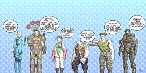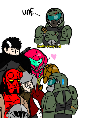While Senkan and the others was on their business, some unexpected visitors made an appearance, who were none other than the great Master Chief, Kratos Ghost of Sparta, Dante the Demon Slayer and the dreaded Doom Slayer.Senkan obviously already knew them, since he spent years fighting alongside them in their respective worlds, making strong bonds between warriors: