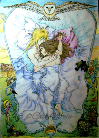I made a draft of Jareth and Sarah, imagining a scene where she regrets having left the Goblin King back.Blue pencil drawing in pollen paper 14 x 21 cm