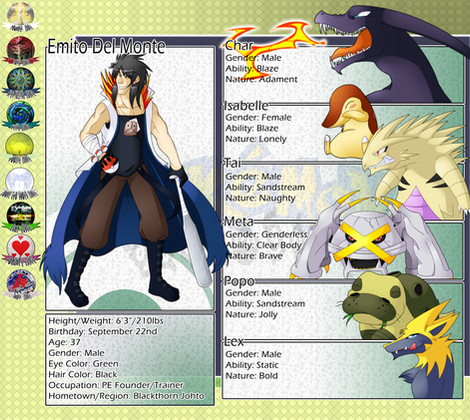 Fighting style: As a policeman, his pokemon are trained to make any kind of threat unable to move the fastest way possible and causing less possible damage to the environment. The only problem is, his pokemon are all from trainers or wild, so they can get hotheaded sometimes.
