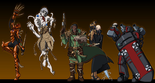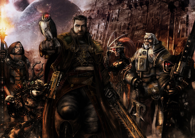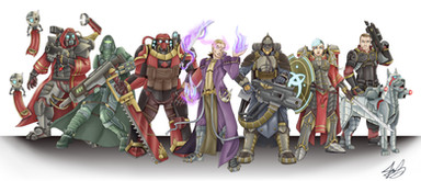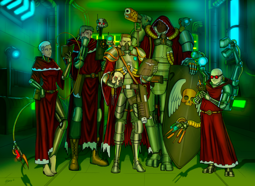 The player characters of my present RPG campaign based in the Warhammer 40K universe.From left to right: Ephraim Ghast, rogue psyker, Sar Satar, sanctioned psyker, Freija Carpathanius, Ex-Arbites, Ranger, Space Marine Scout of the Raven Guard, Armanicus Loqua, rune priest, and Eisen, adept.