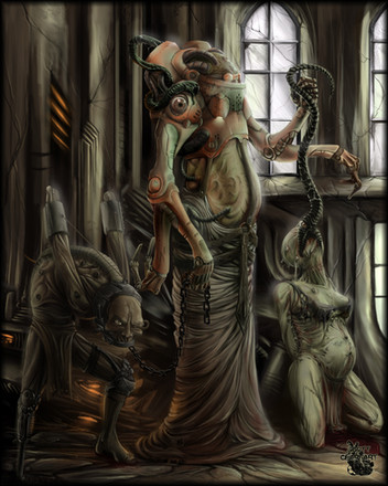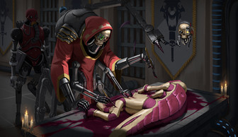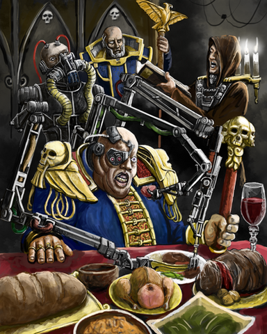 an inquisitorial party at the examination of a xenos specimen; inspired by the Warhammer 40K universeRelated content