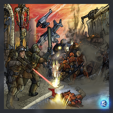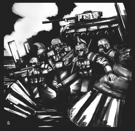inspired by the Warhammer 40K universe; Imperial guardsmen in battleRelated content