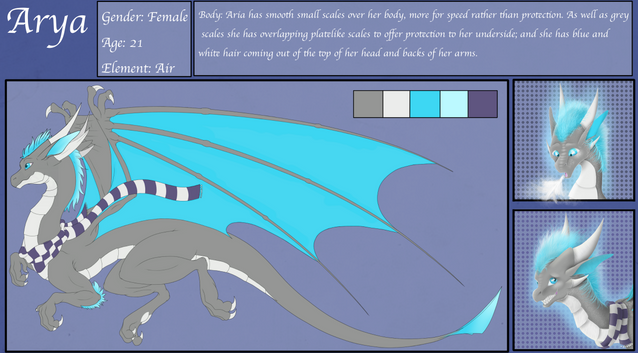 Jackel is a grey and blue drake with deep blue fur around his neck, turning into a lighter blue as the fur gets closer to his body. His eyes are deep blue with light blue glowing swirls as his pupals. He has deep blue horns on his head as well as his tail.