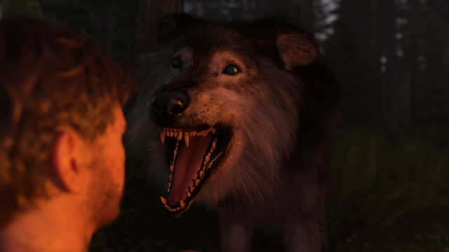 Red is surprised to see the wolf and take a cautious step, looking for an escape.-----------------------------------------------