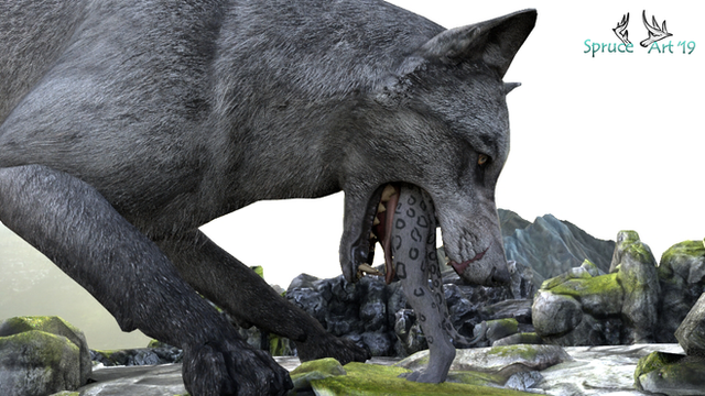 Before she can move far, the wolf leaps. She vainly tries raising her arms to stop the large predator.-----------------------------------------------