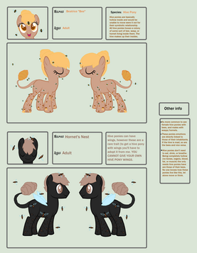 Finally, a reference for my long neglected changeling OC. By long neglected I mean the rough sketch for this reference was done in October 2015.Yellow Jacket a disgruntled, unreformed changeling. She isn't especially good at that love and friendship stuff. Frankly, she's a little on the emotionally stunted side. She's exceptionally short tempered and can be highly aggressive when irritated. Although she is obedient enough to refrain from the 'old way of life', when trying to socialize normally the whole ordeal often feels staged to her and consequently she doesn't like to bother. Changelings being what they are and requiring love as sustenance, Yellow Jacket could aptly be described as 'hangry'. Between the lingering mistrust some ponies still harbor towards changelings and still being the less cuddly form of changeling herself, she often disguises herself as an ordinary pegasus to avoid unwanted negative attention when around ponies.