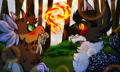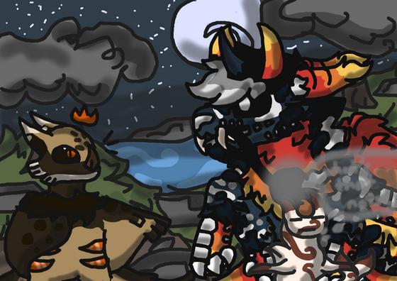He charged again, so she quickly dodged it and ran to the other side of the campfire. He skid to a stop, grass shredding under his claws before he just as quickly, ran to chase after her. It was a surprise to see him unhesitatingly jump over the fire, probably why he was able to pin her down so easily.