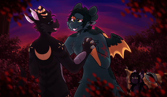 The dark blue quad let out a pained yell, instead starting to run around the small clearing, the jerky movements threatening to make Ember lose her grip. She scrabbled at his shoulders, trying to pull herself up so she wasn't hanging off him with her legs dragging on the ground, but he began to rapidly flap his wings. The movement startled her, his wings flapping harder and almost hitting her square in the face. The moment of distraction made her lose her place over his shoulders, making her slide down his side while she dug her teeth deeper into his scruff to hold on. He made more sounds of pain as he slowed to a stumble, his head being dragged to the side as she scrambled to find the right footing to pull him down.