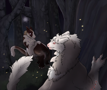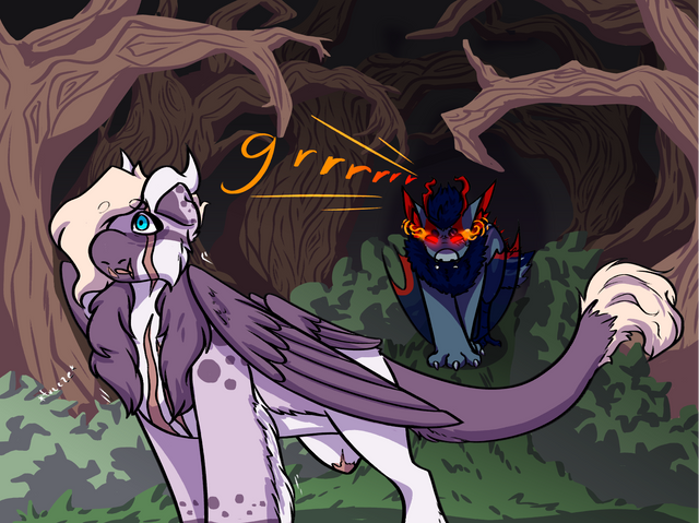 When he caught his breath, she moved to tackle him again, racing forwards with renewed speed. He learned from the first tackle and quickly raised up his front claws, catching her by the shoulders before she could make contact and shoving her off to the side roughly.