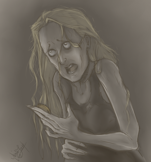 She's too pretty here, and her eyes aren't wonky enough... But I always think of Merope in that Tim Burton Corpse Bridey style...This is the scene in Half-Blood Prince where Merope is trying to sell Slytherin's Locket...