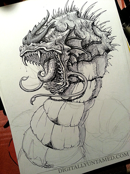 This was a piece created for my graduation exhibition, original print size is 18x24". I'm always fascinated by the Mariana Trench, especially hearing about James Cameron's adventure down there AND the recent filming of the giant squid. This is what I imagined we might disturb with further exploration.Painted digitally in Adobe Photoshop after doing the initial line drawing in ink.