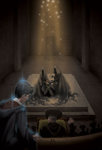 The wispy witch beside him gave a great gasp and slumped in her seat. She had fainted. Crouch appeared not to have noticed.“Take them away!” Crouch roared at the dementors, spit flying from his mouth. “Take them away, and may they rot there!” Harry Potter and The Goblet of Fire