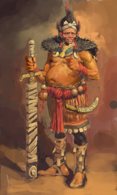 I love all the details in this. The sagging breasts, the large wrinkled belly. Wonderful details, and it all flows together so well. Although he looks like a stupid, fat creature, he is definitely fearsome with those prominent muscles. They hint that he could act quickly and powerfully if given half a reason. Not someone I'd want to mess with, especially with that sword. In this pose, he looks as though he heard a noise and is arching and squinting to see what it was, giving the viewer a chance to sneak past. I'd love to see more of these. Great job!